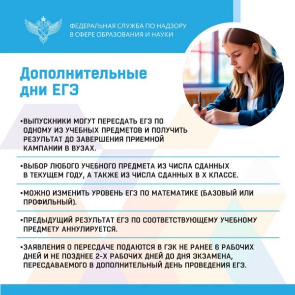 дополнительный день: иностранные языки (письменная часть), информатика, литература, русский язык, физика, химия |