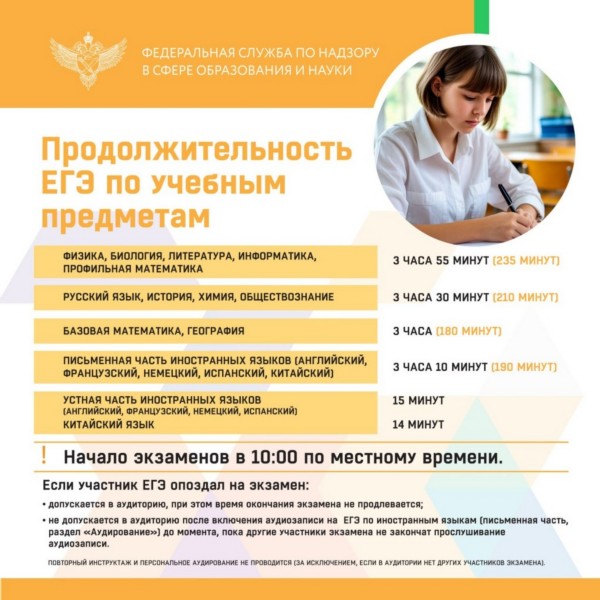 Продолжительность ЕГЭ по биологии, информатике, литературе, математике профильного уровня, физике составляет 3 часа 55 минут (235 минут); по истории, обществознанию, русскому языку, химии — 3 часа 30 минут (210 минут); по иностранным языкам (английский, испанский, немецкий, французский) (письменная часть) — 3 часа 10 минут (190 минут); по географии, иностранному языку (китайский) (письменная часть), математике базового уровня — 3 часа (180 минут); по иностранным языкам (английский, испанский, немецкий, французский) (устная часть) — 17 минут; по иностранному языку (китайский) (устная часть) — 14 минут.