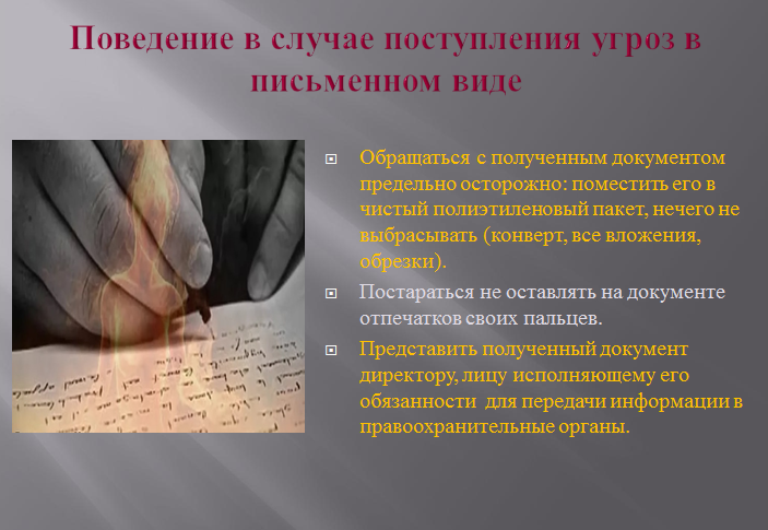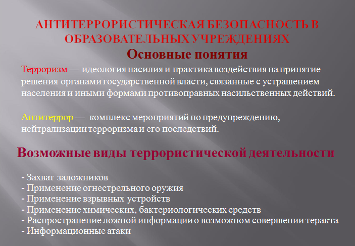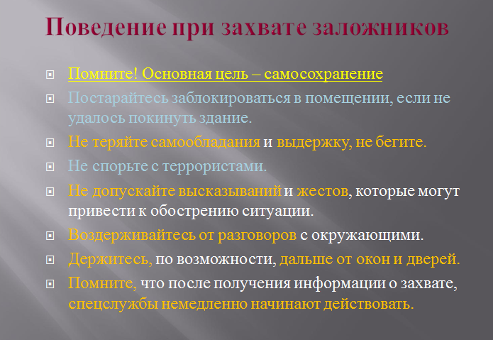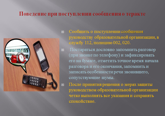 При получении информации, свидетельствующей о возможной подготовке и проведении террористических и экстремистских акций, принять необходимые меры по локализации угроз безопасности, незамедлительно информировать правоохранительные органы или